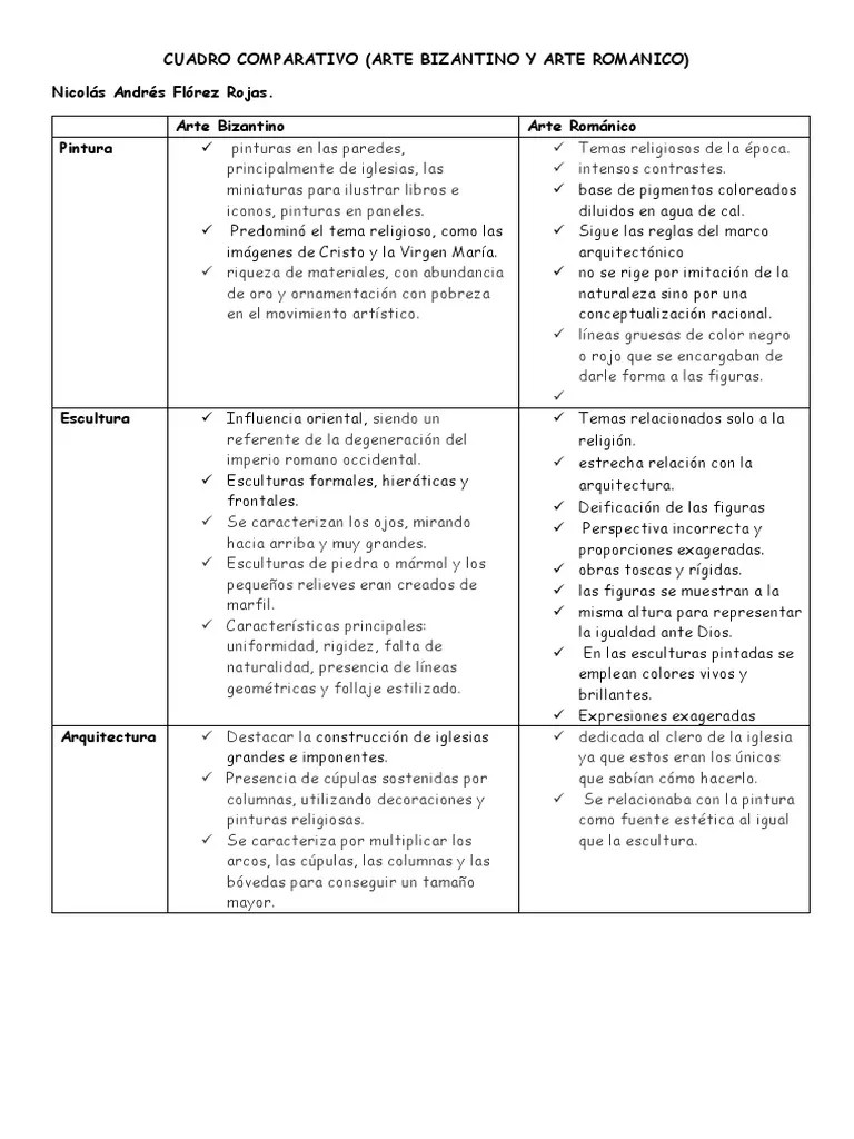 Esto se puede ver, ya que las principales construcciones del primero son la catacumba (excavaciones funerarias fuera de la ciudad) y la basílica. Mar 21, 2016 · cuadros comparativos barroco, bizantino, renacentista, gotico. Cuadro comparativo donde podemos encontrar las similitudes entre el arte paleocristiano, bizantino y románico. Mar 21, 2016 · cuadros comparativos barroco, bizantino, renacentista, gotico.