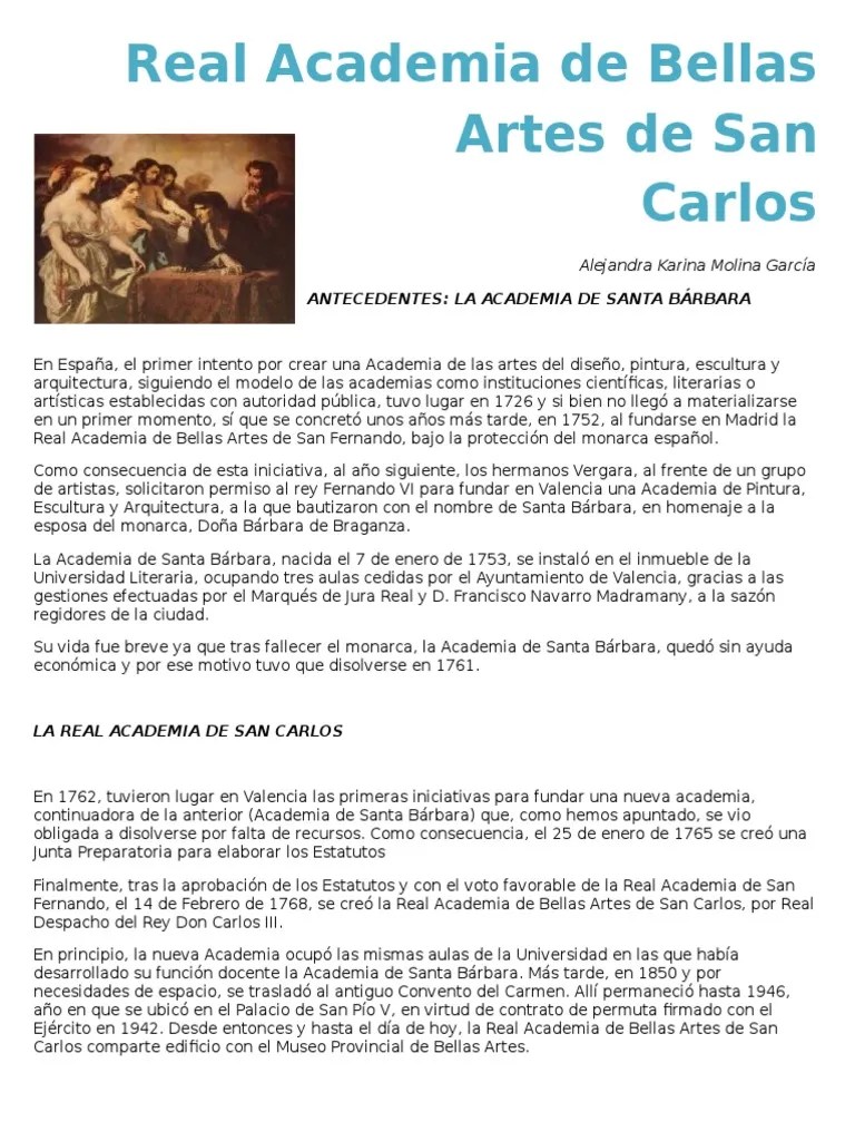 Cuenta oficial de la real academia de bellas artes de san carlos Cuenta oficial de la real academia de bellas artes de san carlos Pintura, escultura y arquitectura.los estudios se organizaban bajo la denominación de menores y mayores. La real academia de bellas artes de san carlos es una corporación cultural de interés público y duración indefinida desde el 14 de febrero de 1768. Saltar al contenido la real academia de bellas artes de san carlos es una corporación cultural de interés público y duración indefinida desde el 14 de febrero de 1768. El 14 de febrero de 1768 el rey carlos iii creaba en valencia la real academia de bellas artes de san carlos, institución académica, que desde su fundación, impartió las enseñanzas de las tres nobles artes: